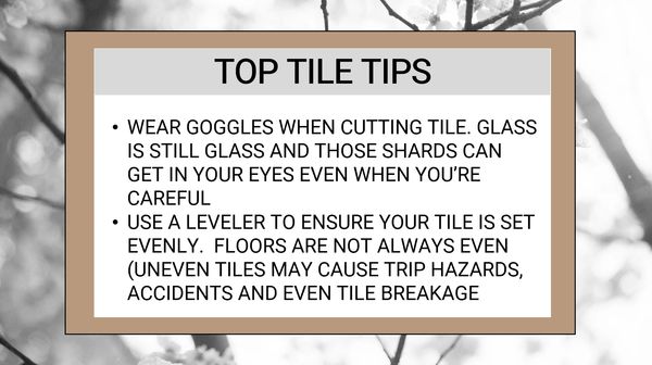 Don’t attempt to grout prior to letting the thinset set for 24 hours. Let it set, clean off any tiles that have leftover thinset because if you wait to remove it later then it will be much harder to remove because it has dried and it will become unsightly. When you are cutting small tile or glass mosaics, not only can it be cumbersome, but dangerous with the amount of shards you may encounter from the cuts. Also, I hadn’t considered such things as how do I cut a tile in the middle without breaking it to accommodate for an outlet, light switch, or window corner. Smaller mosaic tile can be very tedious, whereas large 12x24 tiles require skill to make it happen. It reminds me of a time we were adding a backsplash to our new beautifully designed kitchen, when I took the task to do the tiling alone and without my husband. I thought it would be straight-forward, these were some 4x12subway tiles in a fairly smaller space. Fast forward to cutting around the outlets, and I had a total freak out moment when I realized that I needed to cut halfway into the tile and only remove about a 3x2-inch section forming a U-shape on the tile. I had to pull in the big guns, that is my husband, to complete the task. The vertical cuts were pretty cut and dry, it was “how in the heck are you going to cut horizontally without damaging the rest of the tile.” The answer is “very carefully.” He cut the 2-inch sides with the wet tile saw, but when he needed to cut the 3-inch length of the tile he used the wet tile saw placing the tile very steadily and slowly over the top of the blade while slowly lowering his hand making the tile go down onto the blade just so slightly as to connect the two cut sides. This skill was not something I would have felt comfortable trying for myself. For one, I’m scared to death of these blades and two, my hands aren’t that steady. There may be other methods to try, but research before you begin your project so you’re comfortable with how you’ll implement it. When I’ve applied tile here are the tools I used most: